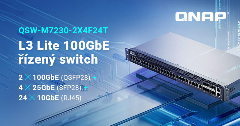 QNAP® Systems, Inc., přední inovátor v oblasti počítačových, síťových a úložných řešení, dnes oznámil uvedení QSW-M7230-2X4F24T, nového L3 Lite řízeného 100GbE switche navrženého pro modernizaci podnikových sítí, prostředí s vysokým výkonem úložišť, rozsáhlou mediální produkci, virtualizaci a úlohy poháněné umělou inteligencí. Nový switch umožňuje organizacím budovat škálovatelnou 100GbE páteřní síť při zachování nákladové efektivity a ochrany stávajících investic do infrastruktury.